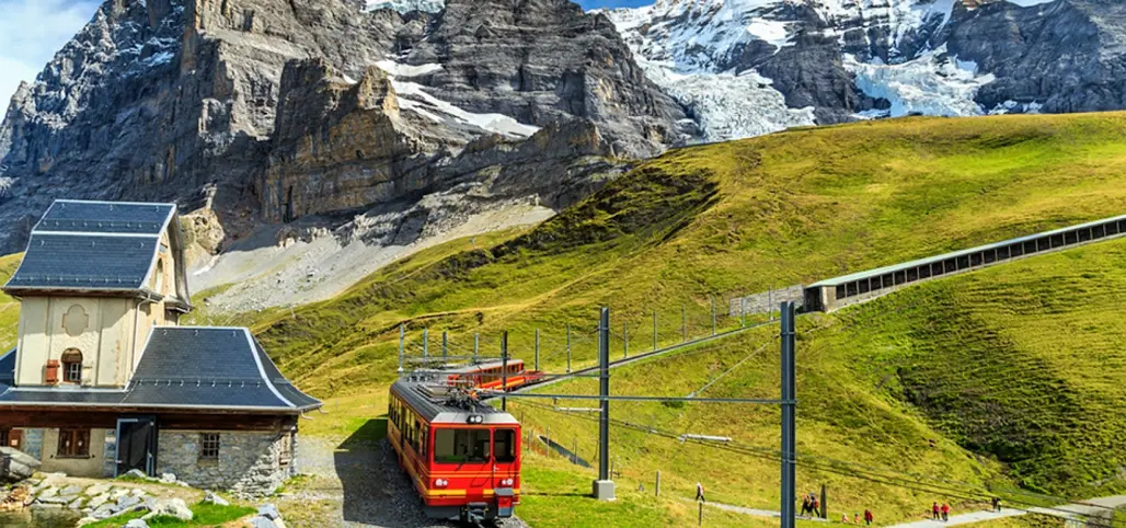 Không thể bỏ qua tuyến Jungfrau Railway - tuyến tàu đi qua những cung đường hiểm trở nhất của dãy Alps. Từ thành phố Interlaken, hành trình sẽ đưa bạn đến chân núi Jungfrau, nơi điểm dừng chân là “nóc nhà Châu Âu”, cao 3.454 mét. Đây là tuyến tàu độc đáo nhất, giúp khám phá vẻ đẹp của các sông băng, thung lũng, các hồ bốn mùa trong trẻo và các khu vườn hoa tràn đầy sức sống trong mùa thu.