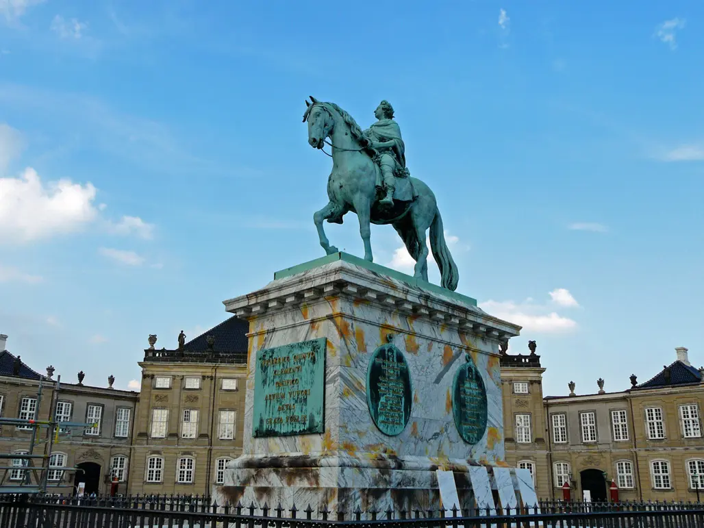 Ngay giữa quảng trường, bức tượng đồng vua Frederick V uy nghiêm sừng sững, tạo thành tâm điểm của toàn bộ không gian. Với hình ảnh vị quân vương trong trang phục hoàng gia, dáng ngồi uy quyền và những chi tiết khắc họa tinh xảo, tác phẩm điêu khắc này không chỉ là kiệt tác nghệ thuật mà còn mang đậm giá trị biểu tượng.