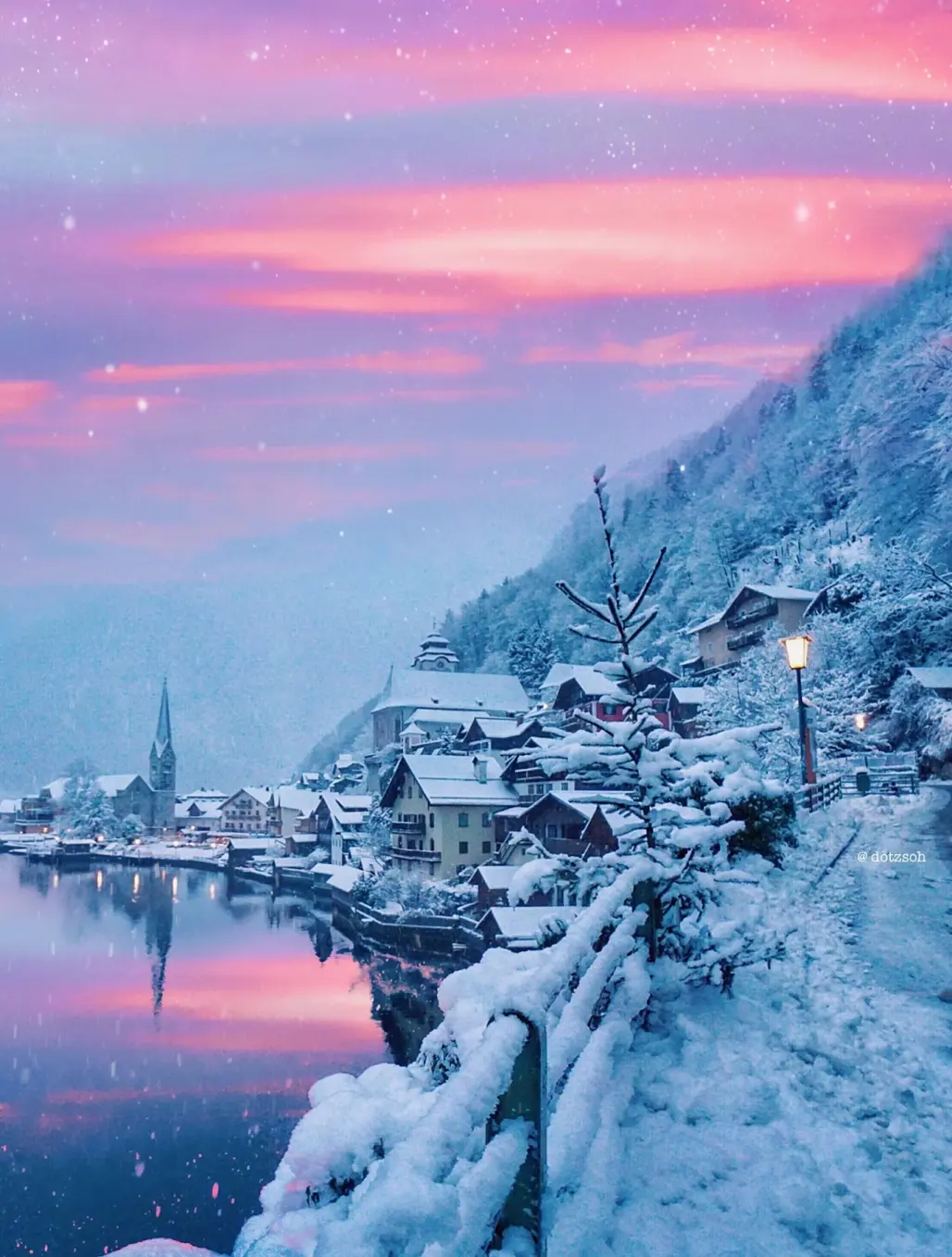 Khi mùa lạnh buông xuống, ngôi làng nhỏ bên hồ Hallstätter See như biến thành một khung cảnh bước ra từ truyện cổ tích. Hồ nước trong vắt phản chiếu tuyết rơi, mái nhà gỗ phủ trắng và những công trình cổ kính hiện lên giữa không gian tĩnh lặng, tạo nên bức tranh thiên nhiên hoàn hảo khiến du khách không khỏi say mê.