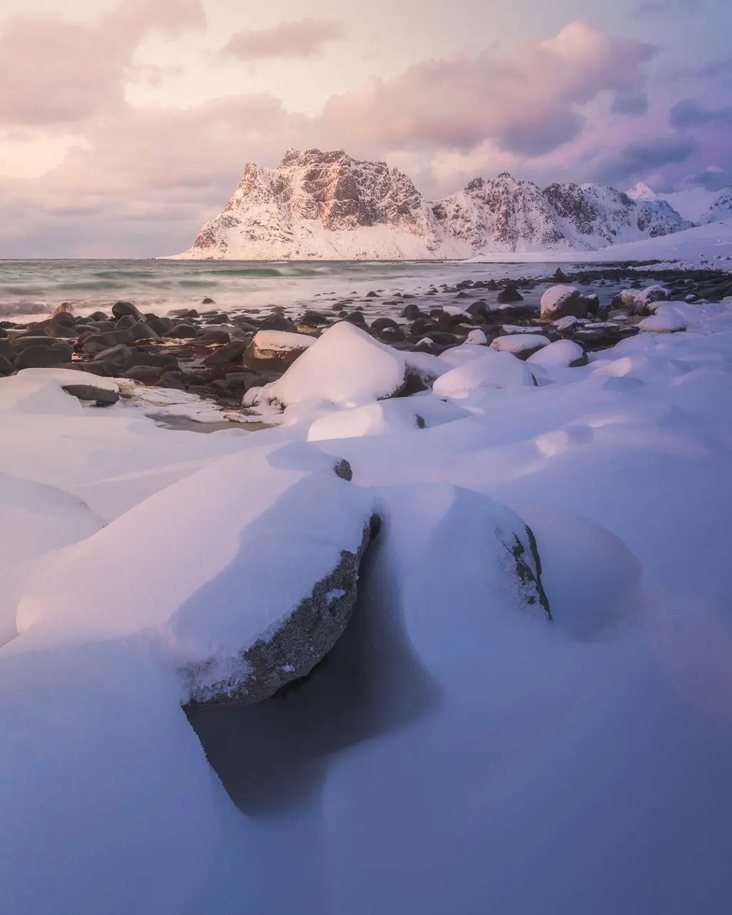 Hai bãi biển nổi tiếng nhất Lofoten – Uttakleiv và Haukland – là điểm kết thúc hoàn hảo cho hành trình chụp ảnh mùa đông.