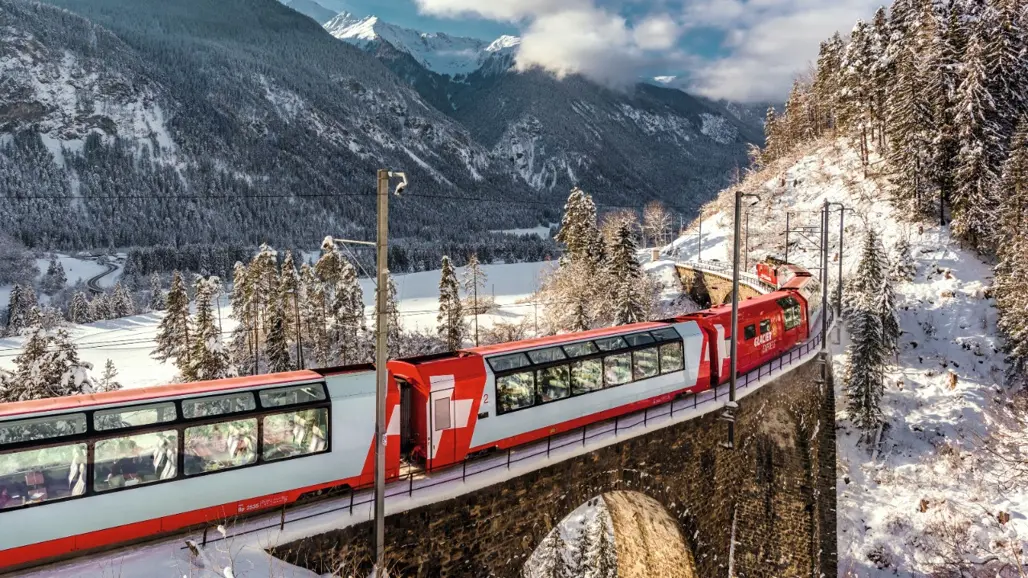 Trong hành trình Switzerland, không thể thiếu trải nghiệm đặc biệt của tuyến tàu Glacier Express nổi tiếng thế giới. Hành trình kéo dài từ Zermatt đến St. Moritz hoặc Davos, đi qua những cảnh quan mùa đông tuyệt đẹp của dãy Alps, từ những cánh rừng phủ tuyết non, đến các thung lũng sâu hun hút, các con sông băng lấp lánh trong ánh nắng và những cây cầu đá cổ kính.