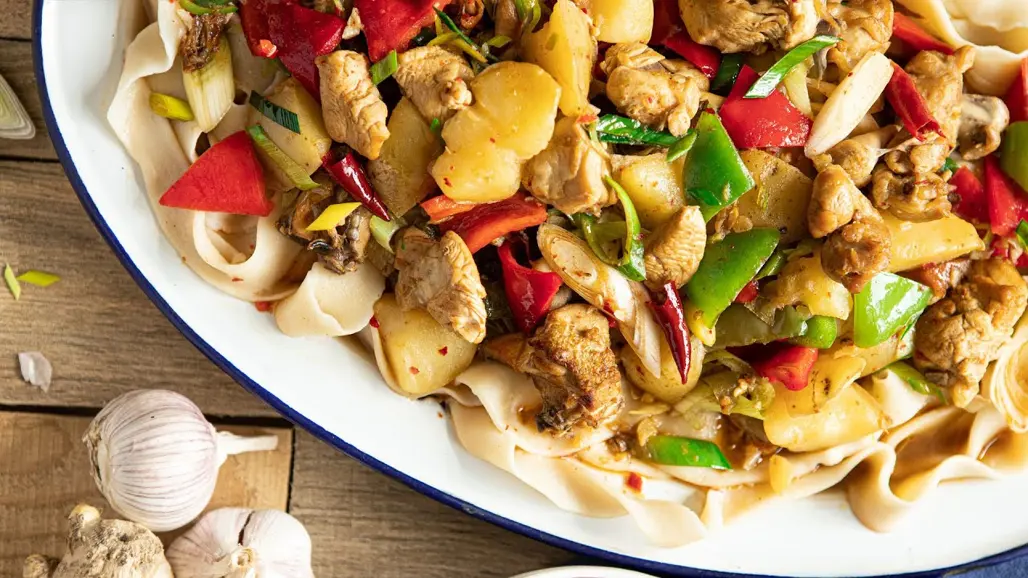 Đại bàn kê hay còn gọi là Big Plate Chicken là một trong những món ăn nổi bật và phổ biến nhất của ẩm thực Tân Cương. Thường được phục vụ trong những đĩa lớn, bao gồm thịt gà, khoai tây, ớt, hành và các loại gia vị đặc trưng, nấu chung với nhau trong một loại sốt đậm đà. Món ăn này rất phù hợp để chia sẻ nhóm đông, thể hiện tính cộng đồng, gắn kết của người Tân Cương.