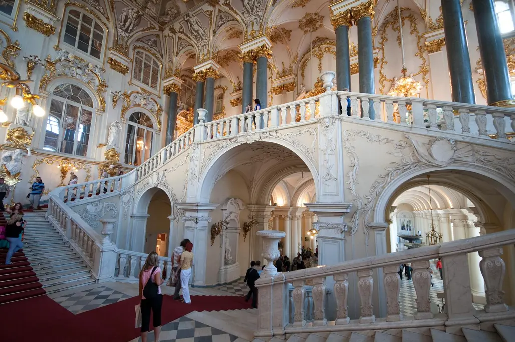 Là một trong những điểm nổi bật nhất của cung điện mùa đông Hermitage, Jordan Staircase tượng trưng cho sự phồn thịnh và tầm vóc hoàng gia. Được trang trí bằng các phù điêu, tượng đắp và các chi tiết trang trí độc đáo, cầu thang này tạo cảm giác hùng vĩ và trang nghiêm ngay từ phút đầu tiên bước chân vào. Bạn sẽ cảm nhận rõ nét không khí lộng lẫy, quyến rũ và cao cấp, như một lời chào đón nồng nhiệt của cung điện dành cho các vị khách.