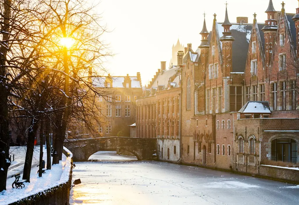 Bruges, còn gọi là thành phố cổ tích của Bỉ, nổi bật với các kênh đào lấp lóa trong mùa đông. Vào dịp lễ hội, thành phố trở nên rực rỡ ánh đèn và có nhiều chợ Giáng sinh, nhà thờ cổ kính, con phố nhỏ xinh đẹp tràn ngập không khí ấm cúng. Các điểm đến Châu Âu này đều mang vẻ đẹp truyền thống, từ nhà thờ thánh Saviour, tháp chuông Belfry, đến các quán café ấm áp trong lớp tuyết phủ trắng.