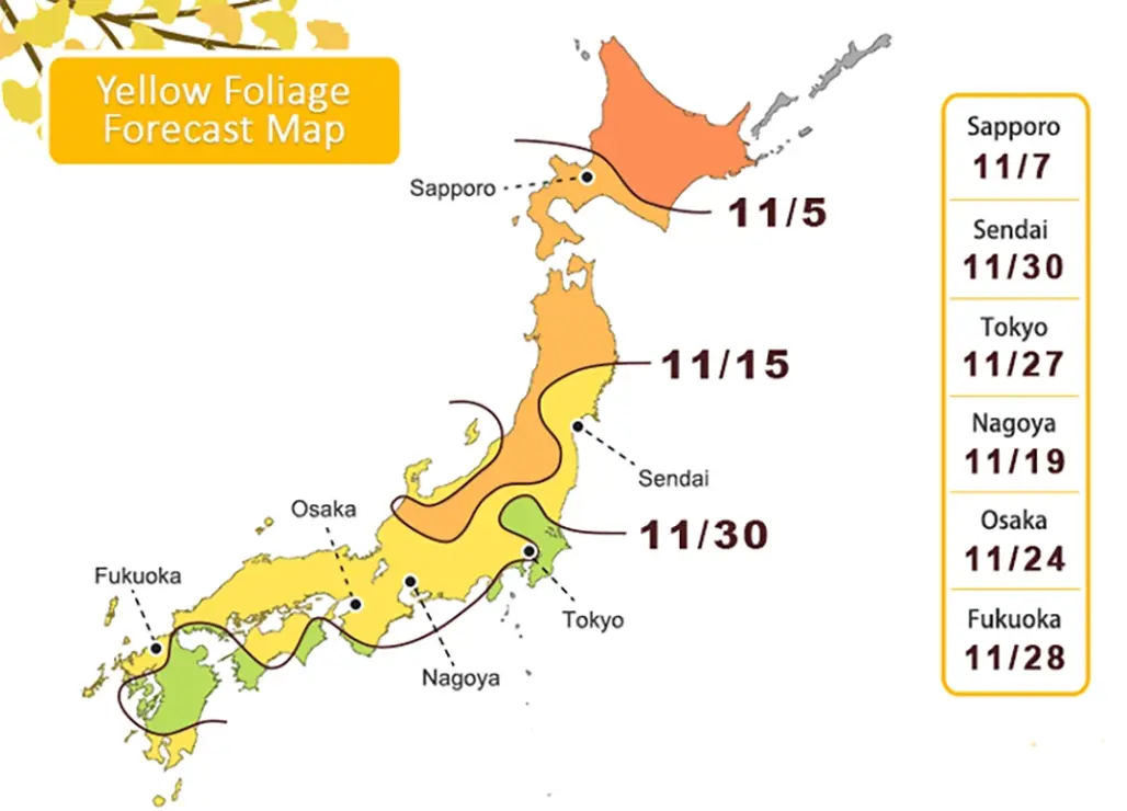 Trong khi đó, Kyoto, Nara, Osaka và các khu vực trung tâm khác bắt đầu chuyển màu từ đầu tháng 11 và kéo dài đến giữa tháng. Các khu vực phía nam như Tokyo, vùng Kanto, thường có thể đón mùa thu từ cuối tháng 11. Bản đồ này giúp du khách dễ dàng theo dõi và chọn thời điểm phù hợp cho hành trình du lịch Nhật Bản để ngắm lá đỏ hoàn hảo.