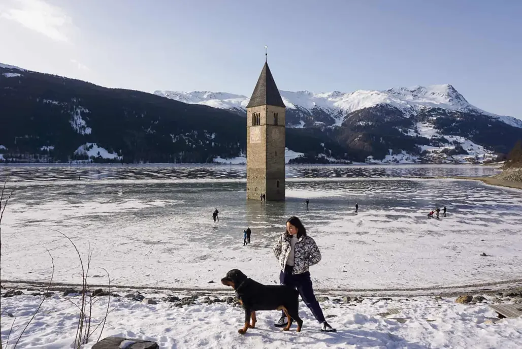Khi mùa đông đến, mặt hồ Resia đóng băng hoàn toàn, tạo thành tấm gương khổng lồ phản chiếu dãy Alps hùng vĩ. Du khách có thể trượt băng thiên nhiên trên mặt hồ, đi dạo giữa không gian tĩnh lặng, hoặc chụp ảnh với biểu tượng tháp chuông giữa tuyết trắng – một cảnh tượng vừa cổ tích vừa kỳ bí. Đây là điểm dừng chân hoàn hảo cho những ai muốn tìm kiếm trải nghiệm mùa đông độc đáo trong hành trình du lịch Châu Âu.