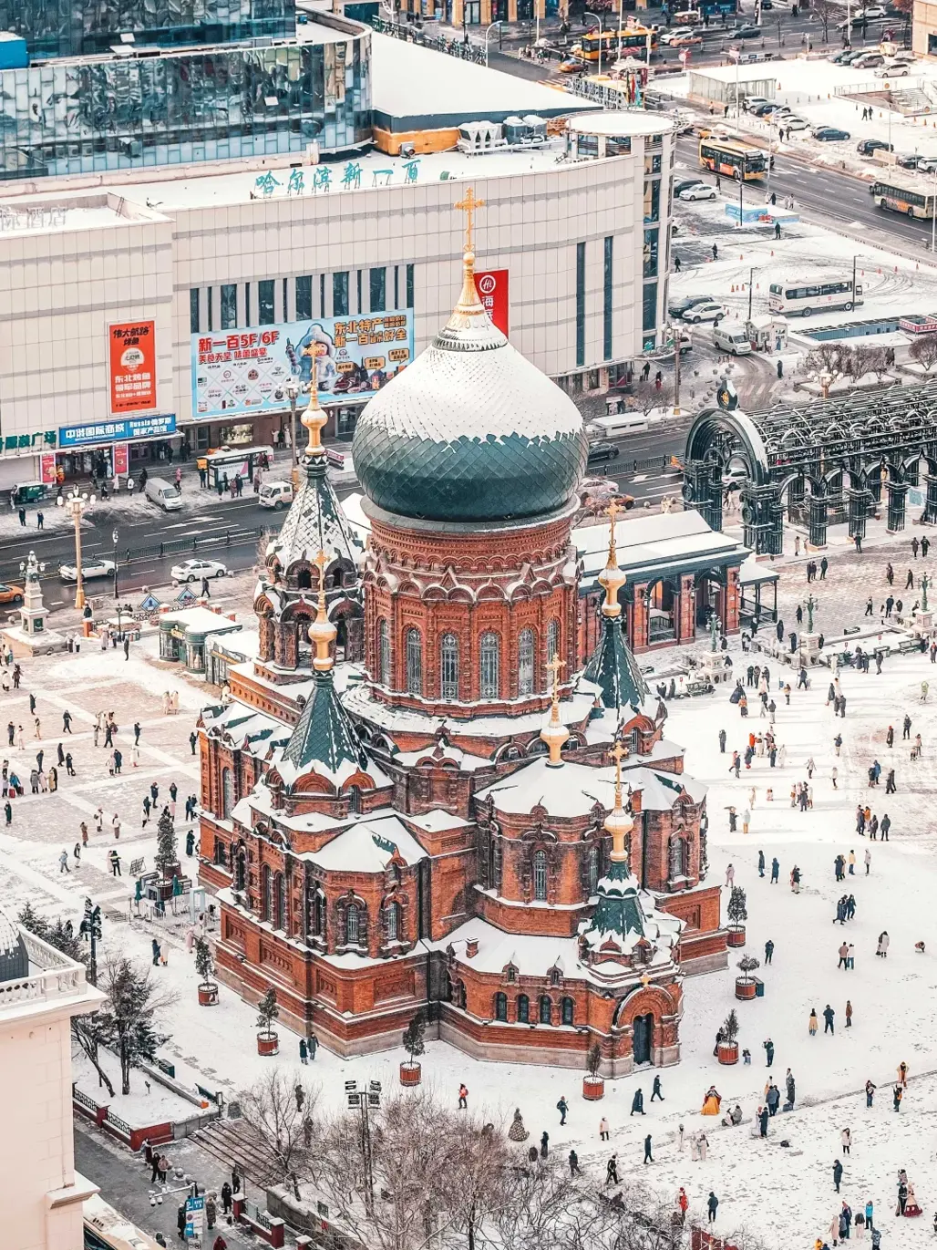 Nhà thờ St. Sophia chính là biểu tượng kiến trúc cổ kính độc đáo của Harbin. Đây là một trong những di tích Âu Mỹ hiếm hoi còn giữ gìn được từ thời thuộc địa, với phong cách kiến trúc Byzantine đặc trưng, mái vòm cong và các họa tiết trang trí tinh xảo. Đặc biệt, vào mùa đông, nhà thờ nổi bật hơn với tuyết phủ trên mái cùng khung cảnh xung quanh phủ lớp băng giá lung linh, làm tăng vẻ đẹp huyền bí, cổ kính của công trình.