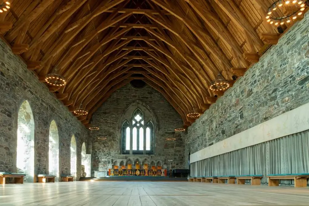 Trong số những hạng mục quan trọng, đáng chú ý nhất là đại sảnh cổ được xây dựng từ thế kỷ 13. Với mái vòm thấp, tường đá dày và lối trang trí giản dị, nơi này vừa mang tính biểu tượng vừa phản ánh rõ phong cách kiến trúc đặc trưng của thời trung cổ.