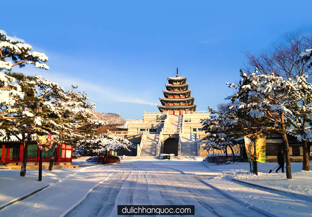 Cung điện Gyeongbokgung luôn là điểm nhấn quan trọng không thể bỏ qua khi du lịch Hàn Quốc bất kể mùa nào. Với kiến trúc đồ sộ, trang nghiêm và nhiều công trình cổ kính, nơi đây vừa là nơi lưu giữ nét đẹp lịch sử vừa là địa điểm lý tưởng để chụp hình kỷ niệm. Vào mùa đông, các kiến trúc mái cong, tường gạch đỏ cùng các dãy hành lang tạo nên khung cảnh vừa truyền thống, vừa đẹp như tranh vẽ.