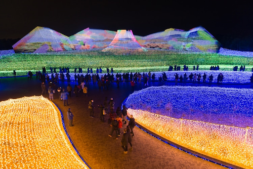 Lễ hội Nabana no Sato Illumination tại công viên Nabana no Sato ở tỉnh Mie là một trong những lễ hội ánh sáng lớn nhất Nhật Bản, thu hút hàng triệu lượt khách mỗi mùa đông. Với hàng triệu chiếc đèn LED tạo thành các tác phẩm nghệ thuật lung linh, hòa quyện cùng cảnh sắc mùa đông dịu nhẹ, lễ hội mang đến cảm giác như lạc vào thế giới cổ tích. Đây là cơ hội tuyệt vời để trải nghiệm nét đẹp văn hóa Nhật Bản qua các lễ hội ánh sáng đặc sắc.