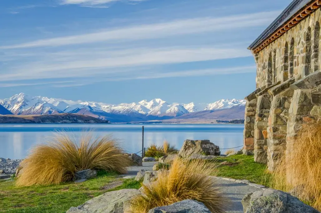Ngay sát bên bờ hồ, Nhà thờ Good Shepherd là một trong những biểu tượng không thể bỏ qua khi đến Tekapo. Với kiến trúc đơn giản mà tinh tế, nhà thờ làm bằng gỗ sồi trắng nổi bật trên nền trời xanh lam, nổi bật trong khung cảnh thiên nhiên tuyệt đẹp của Lake Tekapo.