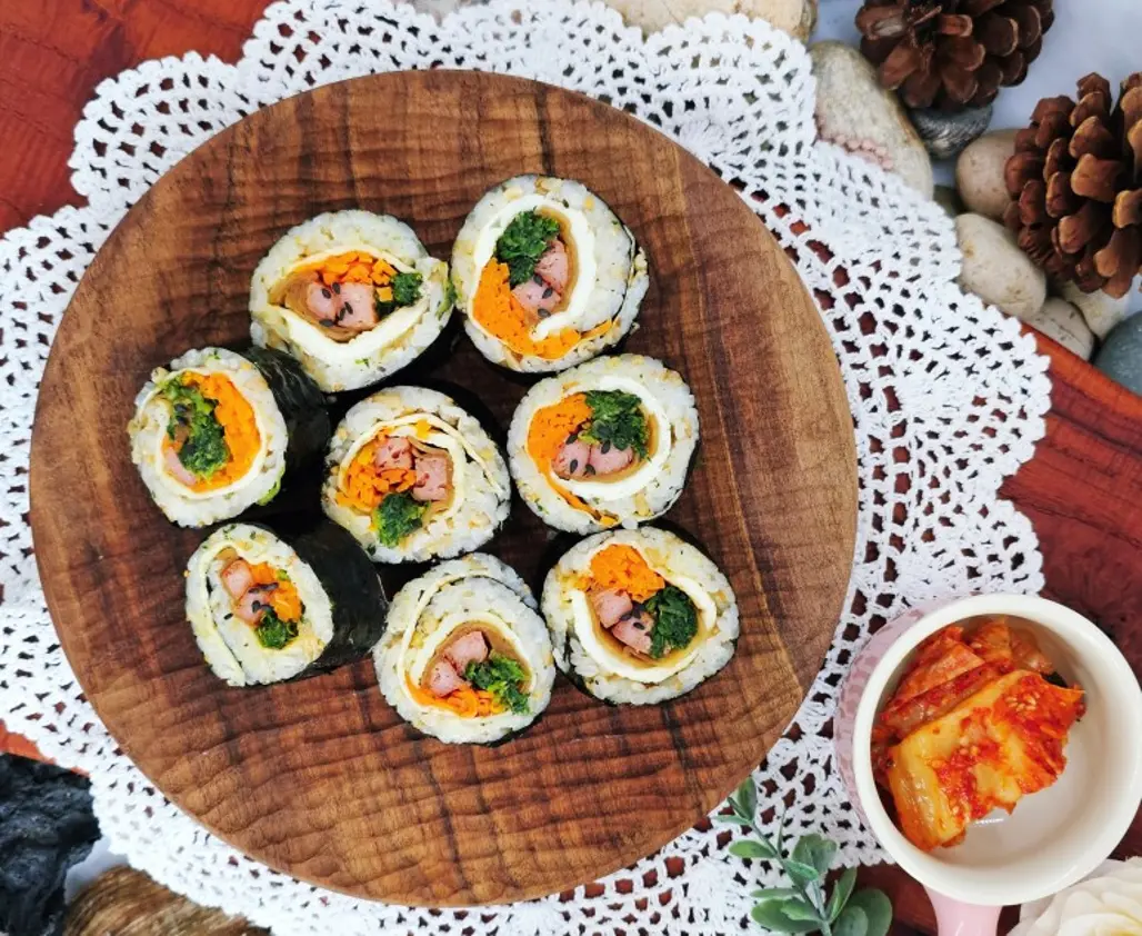 Gimbap, hay còn gọi là cơm cuộn Hàn Quốc, là món ăn quen thuộc nhưng khi kết hợp với chủ đề hoa anh đào, nó mang một diện mạo hoàn toàn mới mẻ. Các nhà sáng tạo đã biến tấu thành các chiếc gimbap với lớp vàng và hồng của hoa anh đào, cùng các nguyên liệu tươi mát như cá hồi, trứng, rau củ, tạo thành một dạng thức mới lạ, bắt mắt.