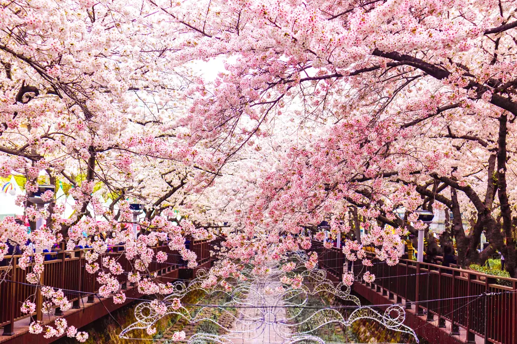 Chạy dọc theo các tuyến phố, các cây hoa anh đào nở rộ tạo thành mái vòm trắng tinh khôi, mỗi bước chân của du khách đều là những khoảnh khắc đáng nhớ. Du lịch Hàn Quốc tại Jinhae là trải nghiệm không thể thiếu trong hành trình khám phá mùa xuân xứ Kim Chi.