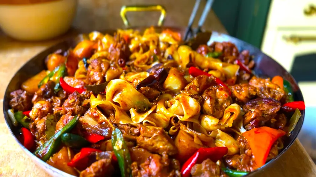 Đại bàn kê hay còn gọi là Big Plate Chicken là một trong những món ăn nổi bật và phổ biến nhất của ẩm thực Tân Cương. Thường được phục vụ trong những đĩa lớn, bao gồm thịt gà, khoai tây, ớt, hành và các loại gia vị đặc trưng, nấu chung với nhau trong một loại sốt đậm đà. Món ăn này rất phù hợp để chia sẻ nhóm đông, thể hiện tính cộng đồng, gắn kết của người Tân Cương.